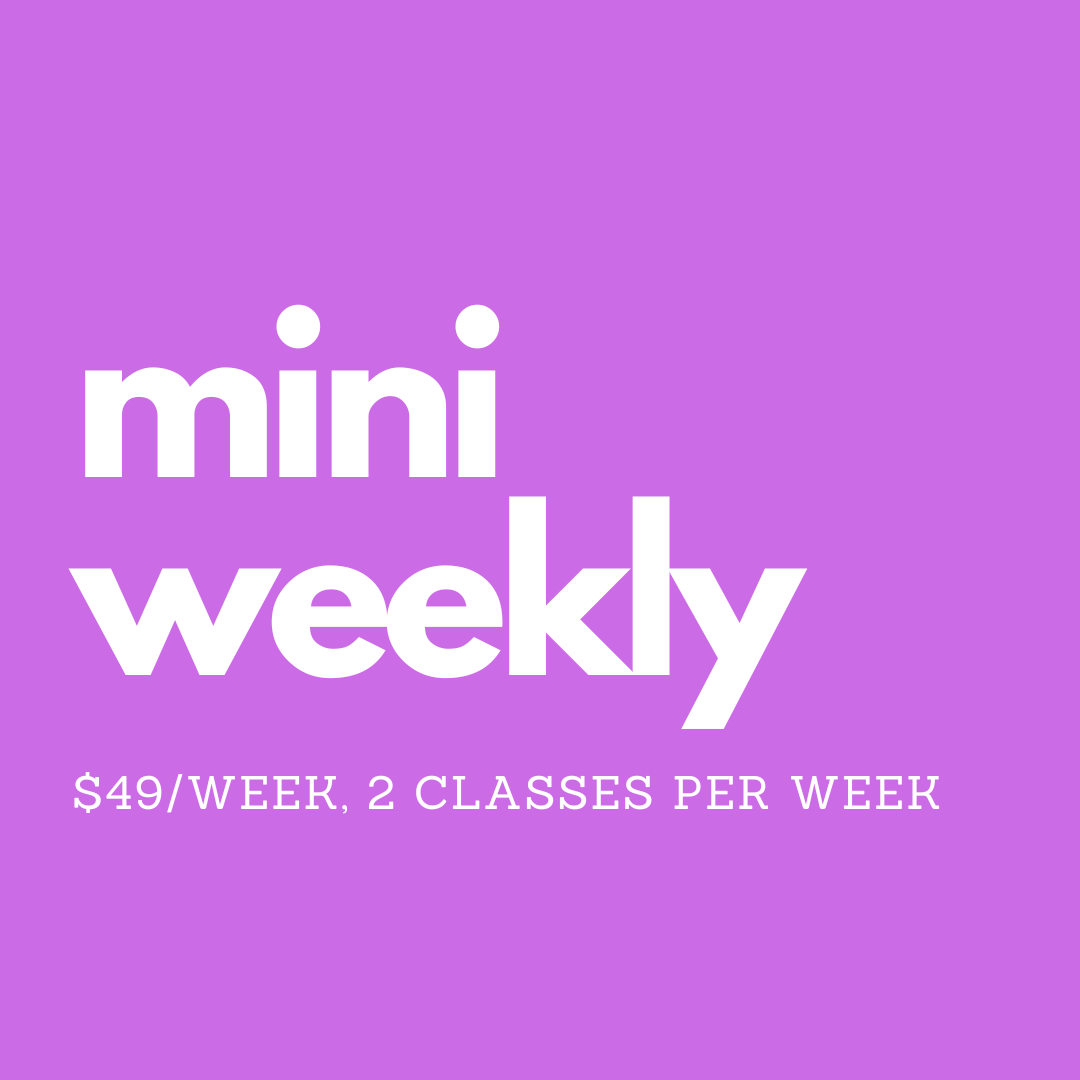 The Mini Weekly Membership gets you 2 classes per week at just $49, making each class just $24.50! (2 Drop-ins per week would normally be $78!) PLUS you will get 15% off all retail purchases AND unlimited access to our VOD library for when you can't make it into the studio. *Auto renews bi-weekly. You can pause your membership up to 4x per year